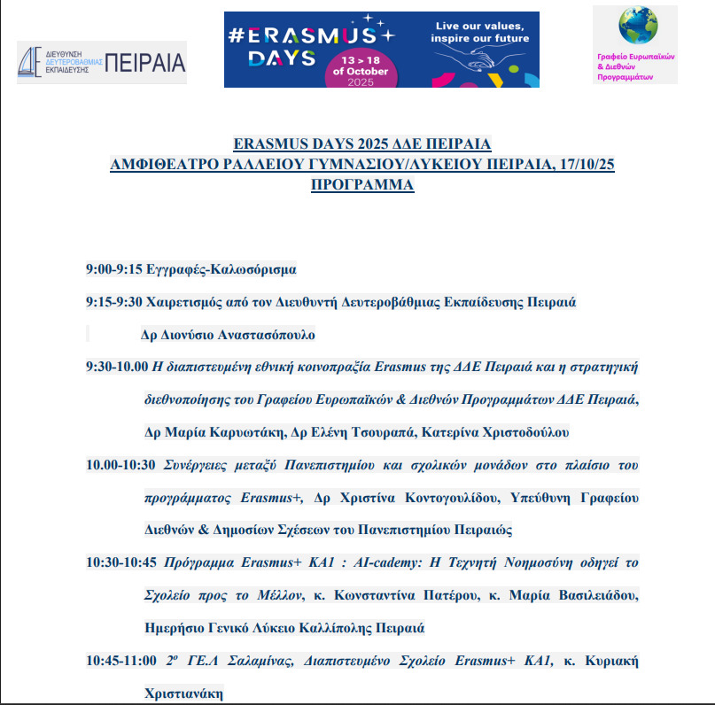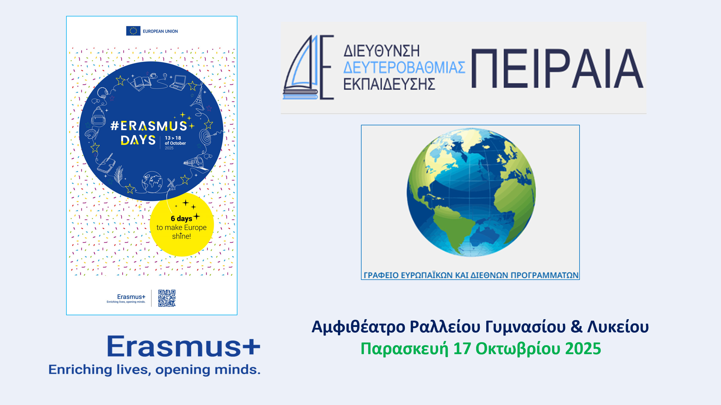 Με επιτυχία και με την ενεργό συμμετοχή του σχολείου μας πραγματοποιήθηκε την Παρασκευή 17 Οκτωβρίου 2025 η ημερίδα “Erasmus Days 2025”, την οποία διοργάνωσε η Διεύθυνση Δευτεροβάθμιας Εκπαίδευσης Πειραιά στο αμφιθέατρο του Ραλλείου Γυμνασίου-Λυκείου.